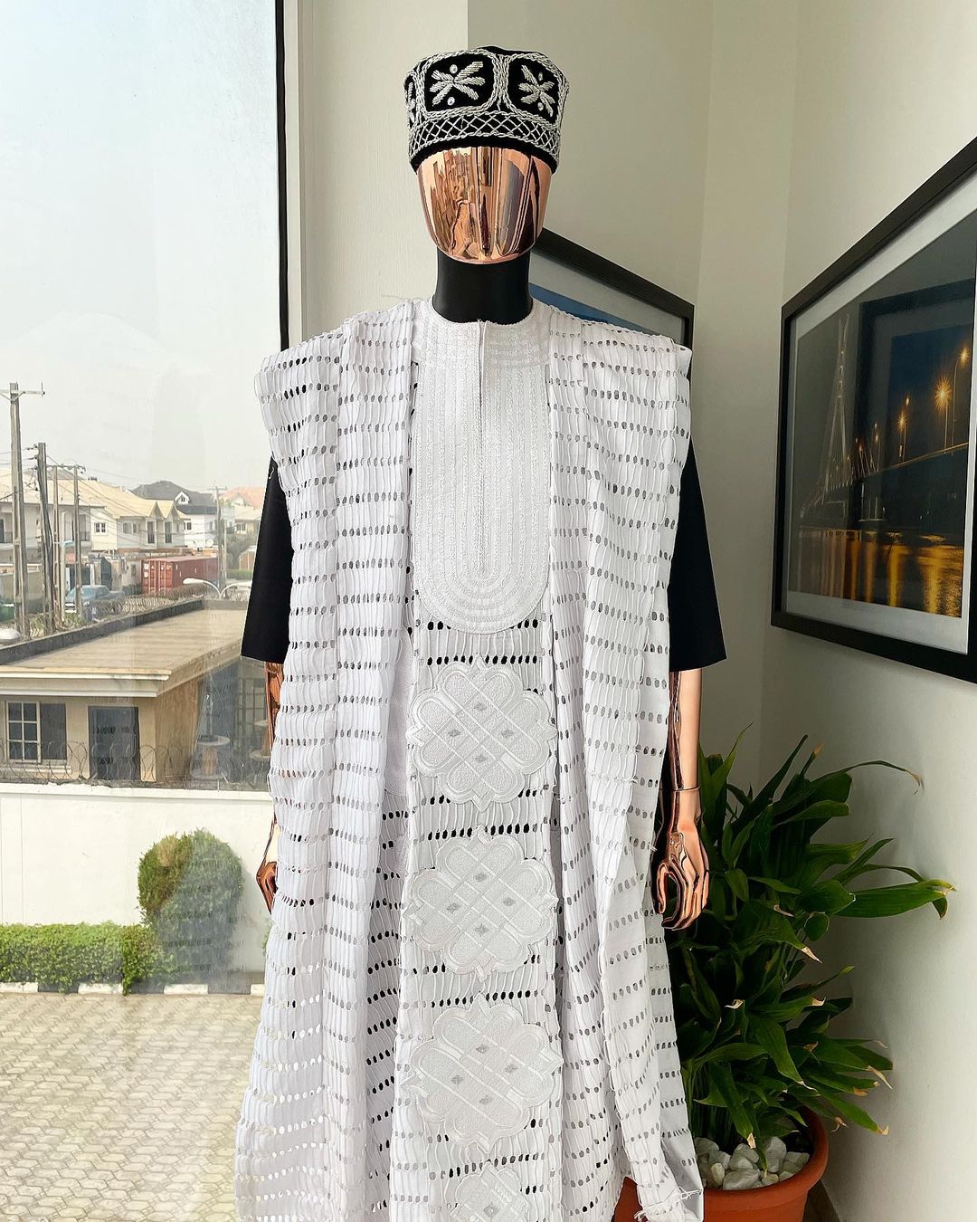 A white dropping line weaving design embroidery agbada
